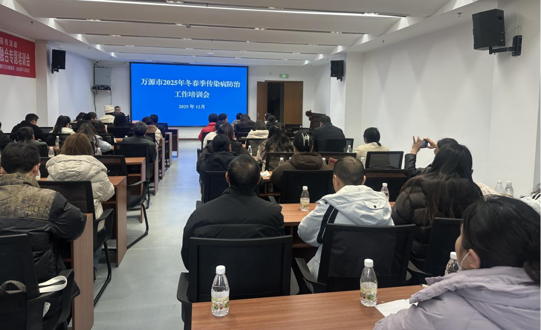 针对当前疫情形势,为提升学校、托幼机构传染病防控工作的规范化和专业化水平,万源市举办多期冬春季重点传染病防控专题培训。重点围绕流感、水痘等疾病的流行特征、防控要点及学校“两案九制”核心制度(如晨午检、消毒隔离、疫情报告等)进行系统讲解,有效提升了各级各类学校早期识别、规范报告和应急处置能力。