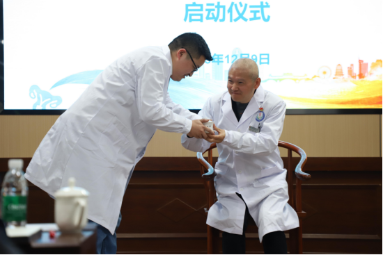 启动仪式上,区卫健局副局长卢玉琴为彭华专家工作室授牌,徒弟代表罗翔向师父彭华敬茶鞠躬,完成庄重的拜师礼,传承医学使命。