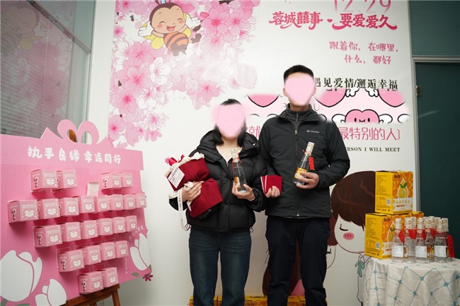 “要爱爱久”背景墙抽奖问答环节将现场气氛推向高潮。新人随机抽取涵盖婚姻家庭经营技巧、婚恋法律常识、文明婚俗知识的问答卡片,现场作答。答对的新人收获寓意婚姻甜甜蜜蜜的蜂蜜水,答错的新人也能在工作人员的趣味科普中补足知识,同时领取暖心礼品,轻松的氛围让新人在欢笑中收获婚姻相处干货。