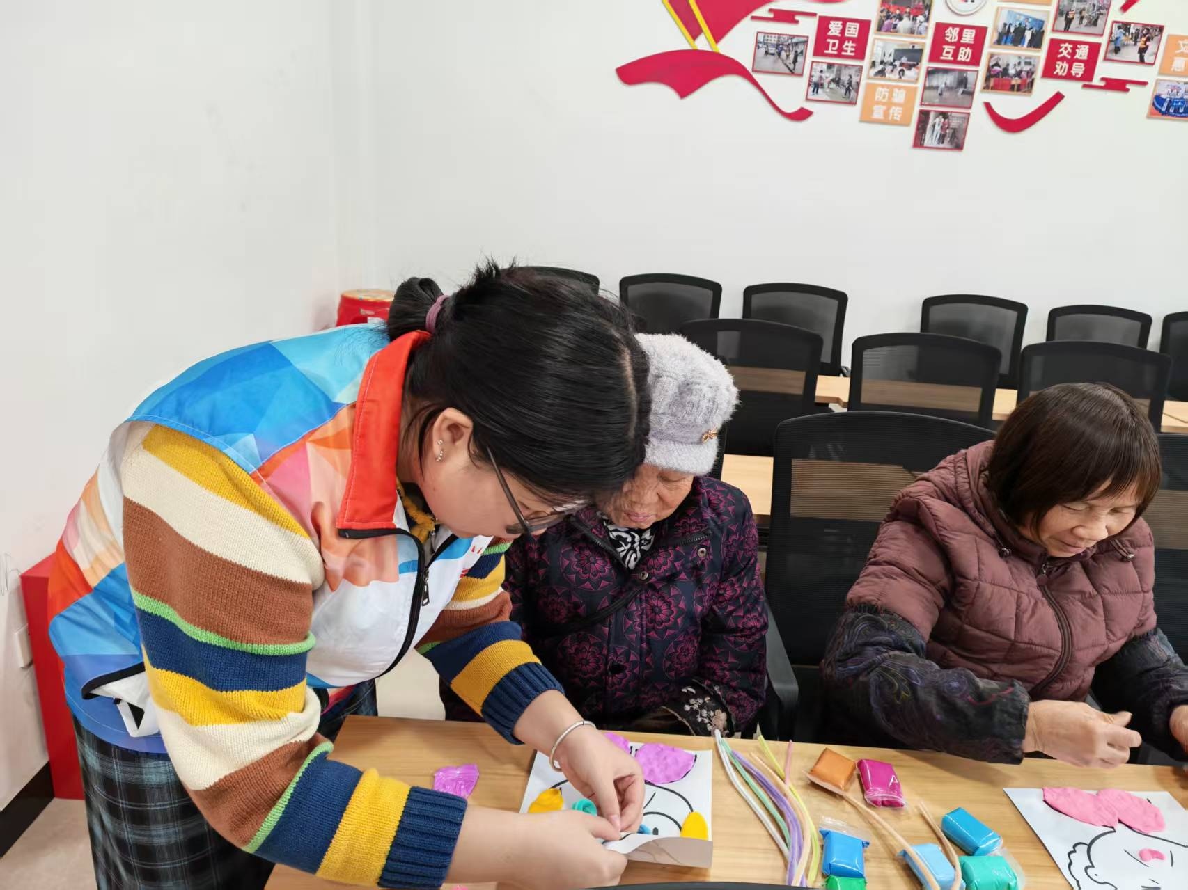 活动尚未开始,活动室里便已是暖意融融。几张长桌上整齐摆放着五彩斑斓的黏土、缤纷各异的扭扭棒,还有剪刀、双面胶等工具。老人们陆陆续续结伴而来,有的拄着拐杖,步履从容;有的牵着老友的手,谈笑风生,活动室里的欢声笑语,早早便驱散了午后的慵懒。
