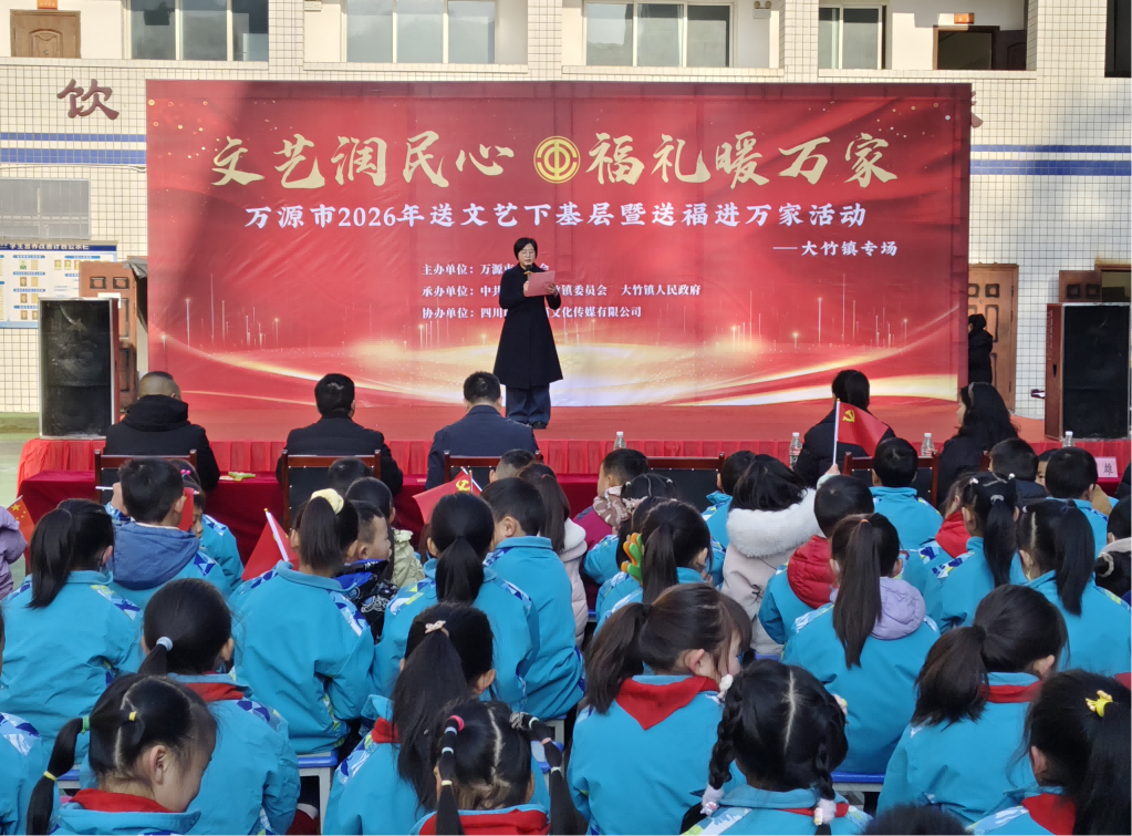 岁末寒冬暖,文脉润心田。1月12日上午,万源市总工会在大竹镇小学校园内,开展了“文艺润民心·福礼暖万家”送文艺下基层暨送福进万家活动。活动以文艺为桥、祝福为礼,为现场1000余名师生及职工群众奉上文化盛宴,让大家在精彩演出与翰墨飘香中提前邂逅浓郁年味,感受新春暖意。市总工会党组书记、副主席魏作利,大竹镇党委书记冉启疆,镇人大主席、工会主席王珊,市总工会党组成员邓茜等参加活动。