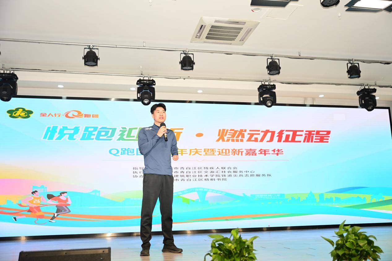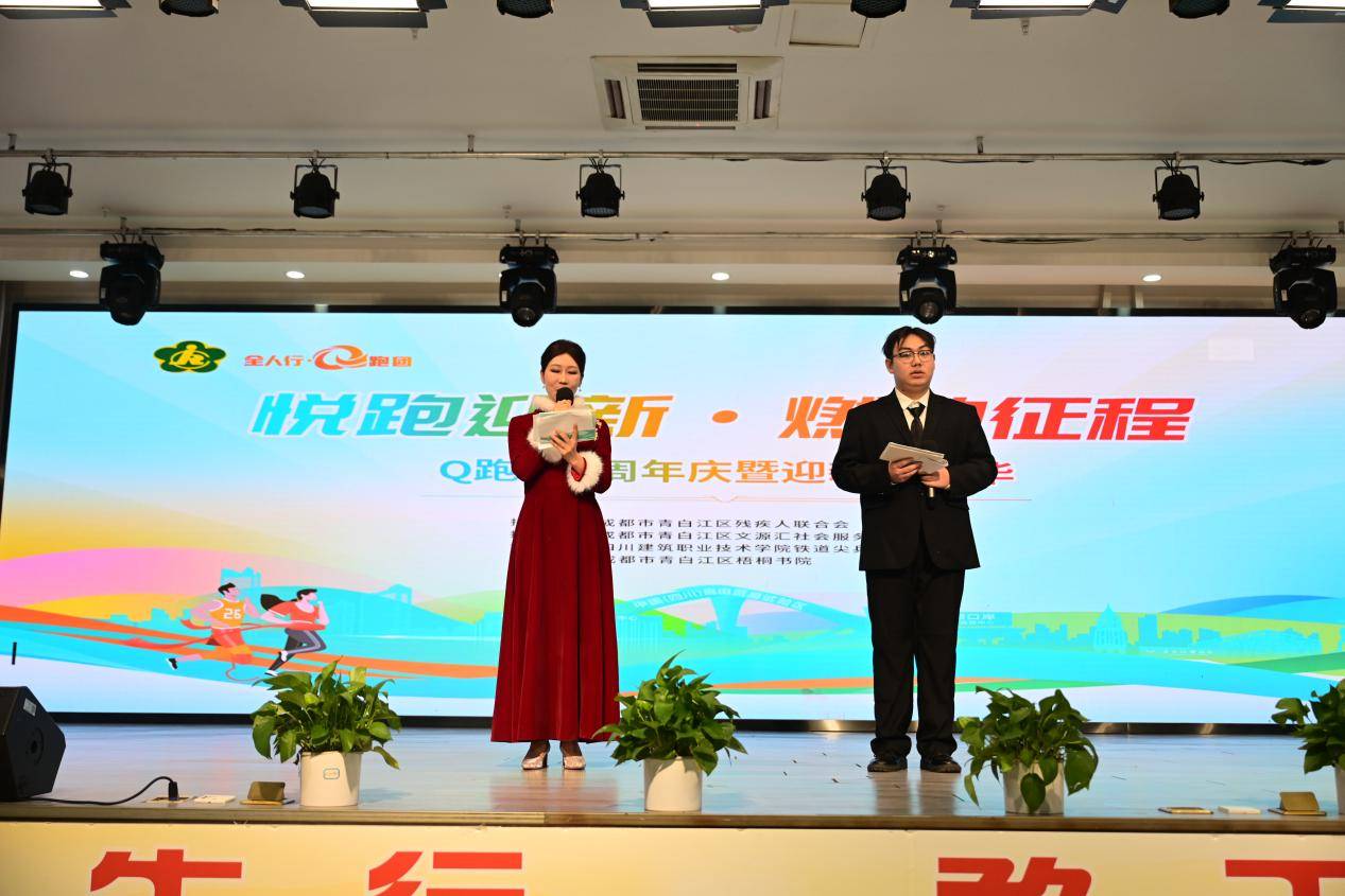 活动伊始,主持人介绍了莅临现场的领导和嘉宾,包括四川建筑职业技术学院铁道工程系党总支副书记刘丽、学生党支部书记王亮等师生代表,青白江区盲协主席吴修全、副主席姚燕丽,四川省残疾人跆拳道运动员、成都市残疾人跆拳道运动队队长、Q跑团名誉团长沈力,以及青白江区文源汇社会服务中心党支部书记蒋雪玲、中心理事长廖漫波、形象大使蒲忠明、华永芳等80余人参与活动。在热烈的掌声中,“悦跑迎新·燃动征程”Q跑团6周年迎新嘉年华正式拉开帷幕。