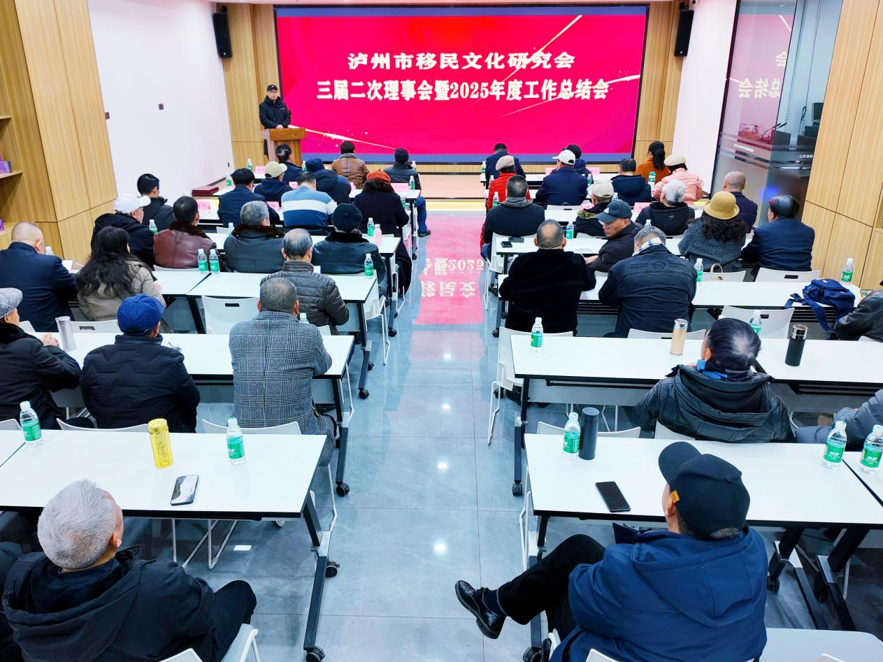 会长陈泽治对2025年度泸州市移民文化研究会工作进行了总结。2025年,研究会在多部门指导下,围绕中心工作团结会员,在多方面取得进展并完成任务。工作上,加强党的领导并与党支部协同推进多项工作,完成换届登记;狠抓自身建设,新增两个专委会并开展多项活动;重视专委会活动,使其成果丰硕;积极参加文化活动,展示成果与收集资料;深化理论研究,举办研讨与编制资料;开展基层宣讲并举办比赛;推动古镇经济转型调研遗迹;狠抓出土文献保护与阐释;参加公益事业。陈泽治会长还总结了成功经验与存在问题,并阐述了2026年工作打算,包括继续学习贯彻相关精神、举办演讲、推进课题与出版、扩大影响、开展公益、加强意识形态及自身建设等工