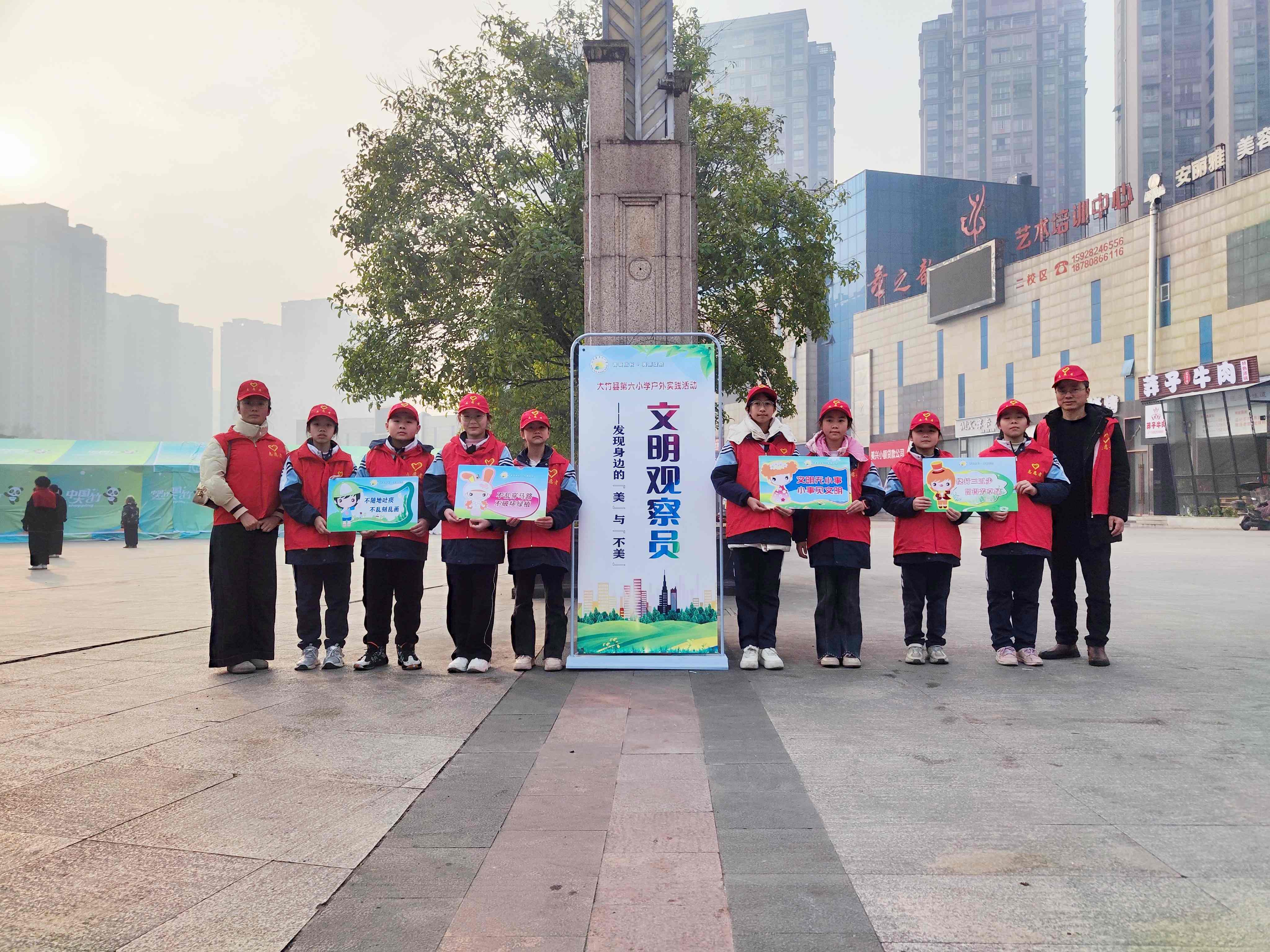 冬阳暖照竹城,文明之花初绽。2026年1月16日至17日,大竹县第六小学4年级8班、5年级1班师生分批走进竹城一号广场,开展“文明观察员——发现身边的‘美’与‘不美’”户外实践活动,让学生在真实场景中深化文明认知。