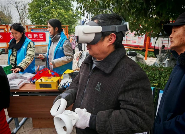 活动现场设置了触电模拟体验及VR工伤事故模拟环节,由专业人员现场指导居民开展违规操作风险体验。通过“一秒触电”的生理感知与虚拟现实事故场景的沉浸式再现,将工伤预防政策转化为直观的感官认知。安全帽、安全带等劳动防护用品的实物展示与规范穿戴教学,使居民准确掌握不同作业环境下的防护要点,切实提升个人防护实操能力。三个沉浸式体验区构成的“风险感知三角”,有机融入工伤保险政策核心内容,使居民在互动体验中既掌握安全技能,又深化参保意识。