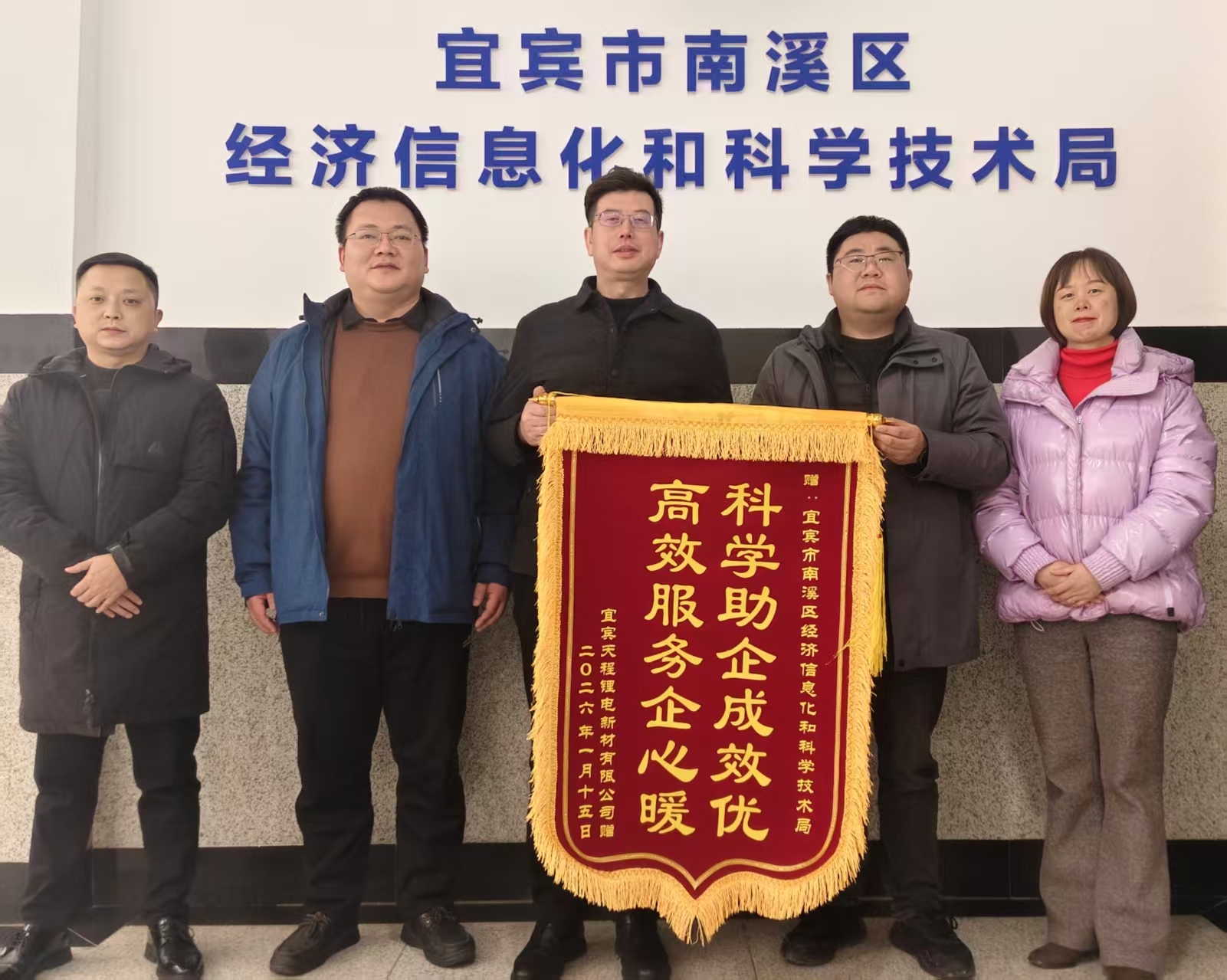 近日,宜宾天程锂电新材有限公司负责人专程前往宜宾市南溪区经济信息化和科学技术局,将一面印着“科学助企成效优 高效服务企心暖”的锦旗郑重赠予该局,以此表达对该局在企业发展过程中给予精准帮扶、有力支撑的诚挚谢意。