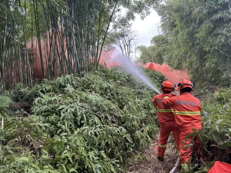 演练中,“火情”随地形、风力持续升级,飞火蔓延、陡坡密林阻隔等突发状况接连出现。专业队员沉着应对,运用“一点突破、两翼推进”战术,高压水枪精准压制火头,义务扑火队快速清理障碍,同步规范开挖15米以上宽防火隔离带,从源头阻断火势。各小组分工明确、衔接紧密,多战术协同作战水平在实战中显著提升。