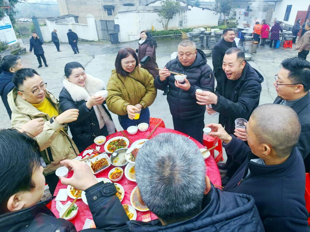 书法家们还书写了大量饱满圆润的“福”字,寓意福气满满、幸福安康。员工、家属和合作伙伴们围在旁,欣赏书写过程,不时发出赞叹。大家有序领取春联和“福”字,喜悦之情溢于言表。员工陈彬兴奋表示:“书法大师手写的春联更有年味,感谢公司贴心的新春礼物。”写福送春联活动进行时,公司年会也有序开展。大家围坐摆满美食的餐桌旁,品着华阳美酒,醇厚酒香在舌尖散开,带着一年的辛劳与收获;吃着刨猪汤、九大碗等传统佳肴,热气腾腾,满是家乡味道与浓浓温情。酒过三巡,大家话匣子渐开,畅聊今年收获与未来打算。