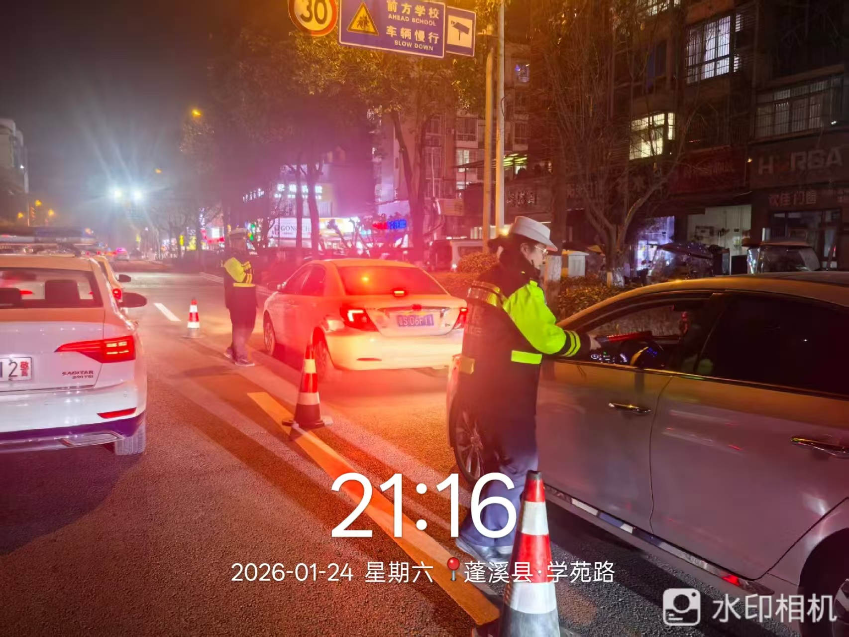 为切实做好2026年春运期间道路交通安全管理,最大限度消除因酒后驾驶引发的交通事故。蓬溪交管大队立足当前交管实际,科学布警,重拳出击,扎实开展周末夜间酒驾醉驾专项整治行动,确保辖区道路交通安全形势持续稳定。