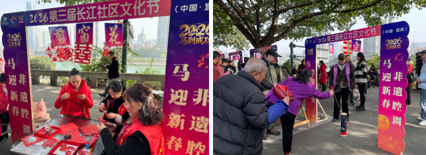 为丰富居民节日文化生活,弘扬优秀传统文化,1月26日,宜宾翠屏冠英社区新时代文明实践站以宜邻课堂和长江社区文化节活动为契机,在滨江驿6号点位组织开展了“非遗腔调 马迎新春”第三届长江社区文化节暨新春游园活动。
