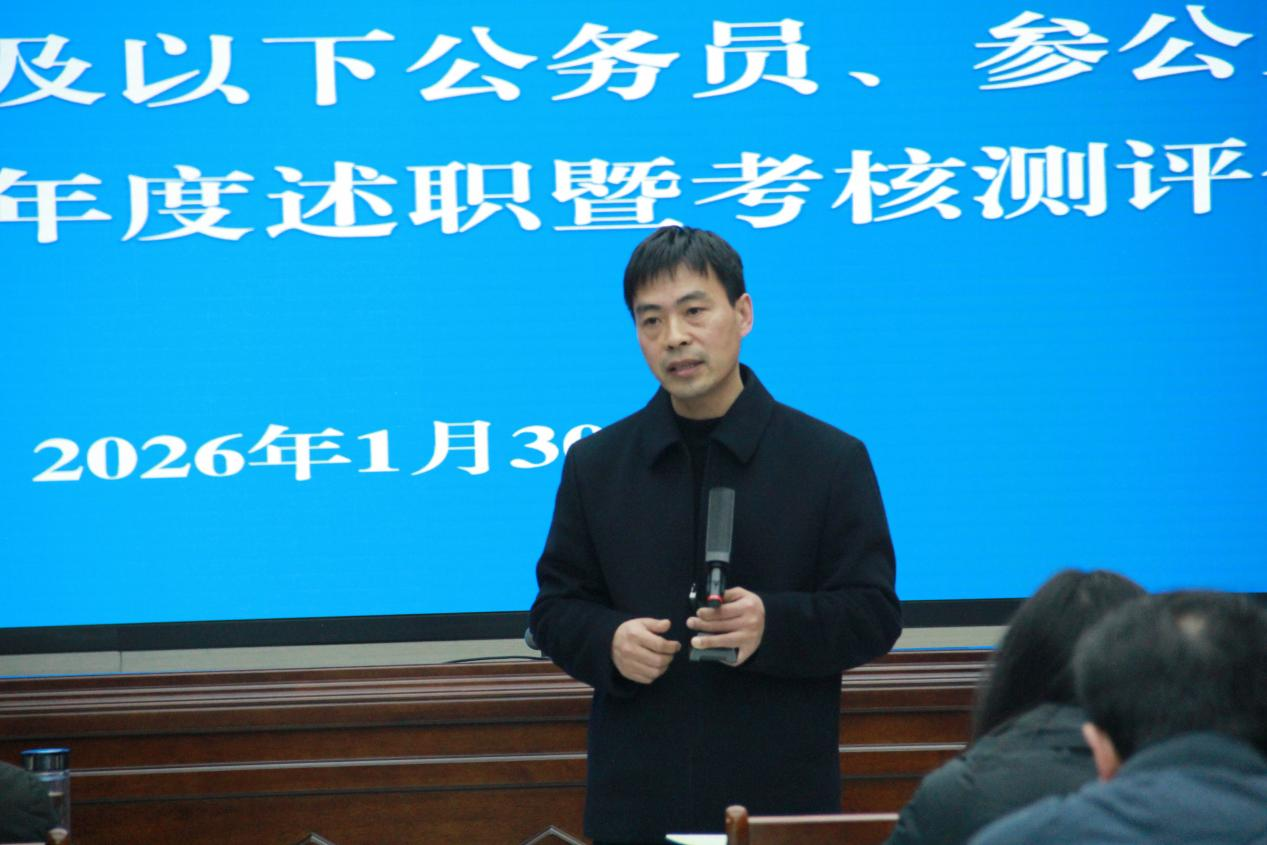 1月30日,宜宾市应急管理局召开2025年度科级及以下人员年度述职暨考核测评会议。局党委书记、局长聂泰民主持会议并讲话,局机关、原执法支队及下属事业单位全体在编在册干部职工共80余人参加会议。