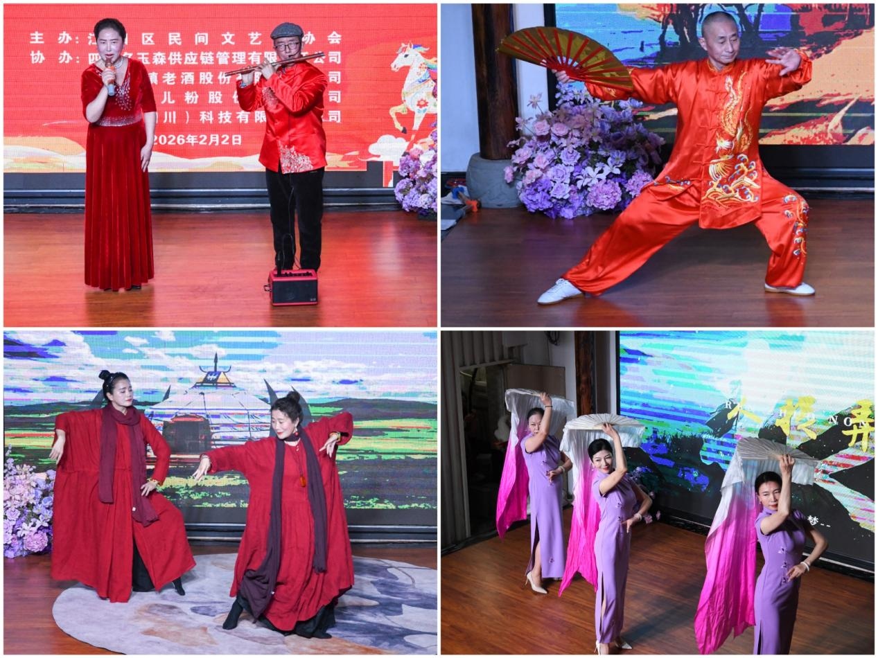 2月2日下午,泸州市江阳区滨江路蜀禾源热闹非凡,由泸州市江阳区民间文艺家协会主办,四川名玉森供应链管理有限责任公司、泸州肥儿粉股份有限公司、四川泸镇老酒有限责任公司和百拿(四川)科技有限责任公司协办的迎春团拜会在此欢乐举行。现场气氛热烈、精彩纷呈,这是一场集工作汇报、嘉宾讲话与文艺表演于一体的综合性活动。