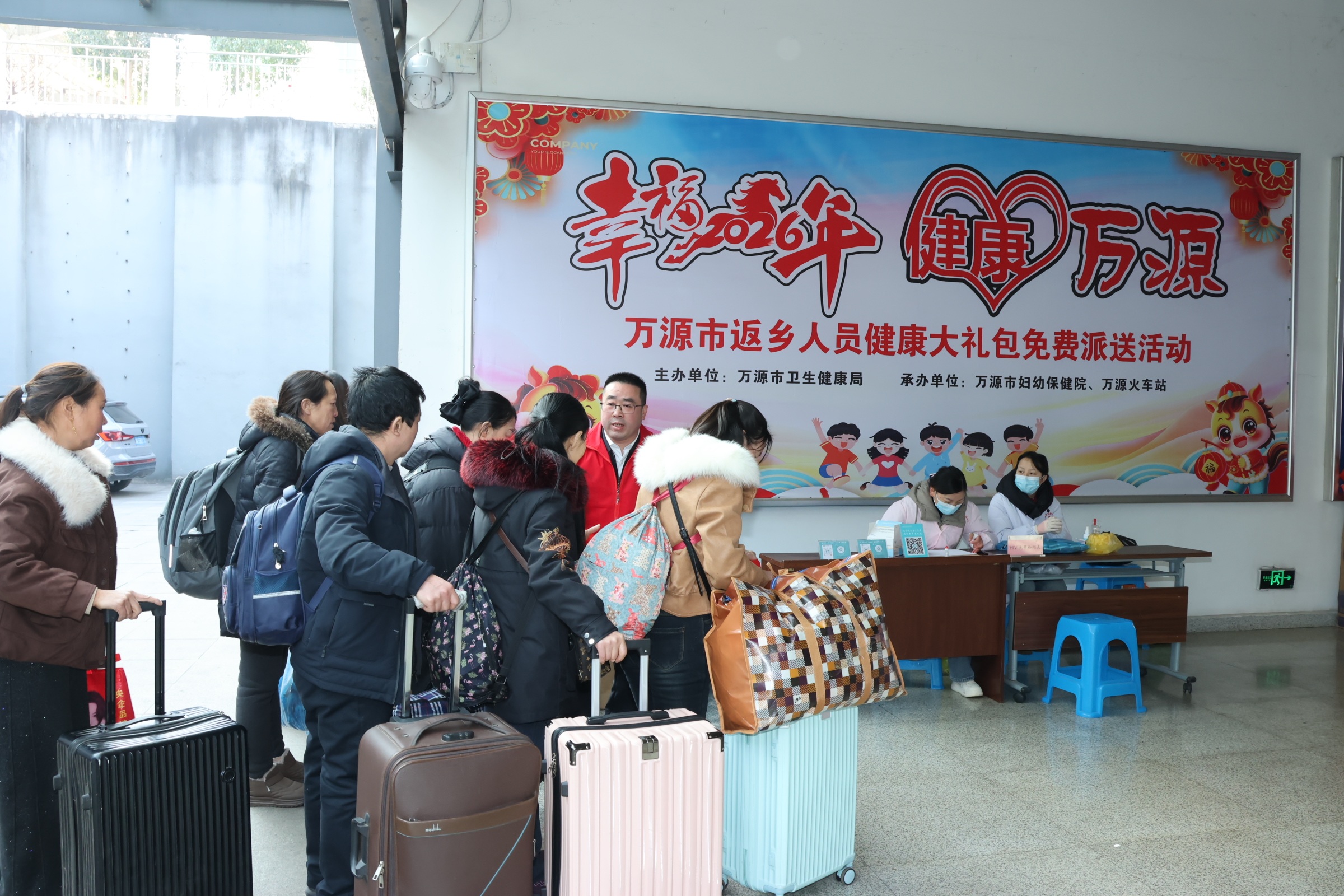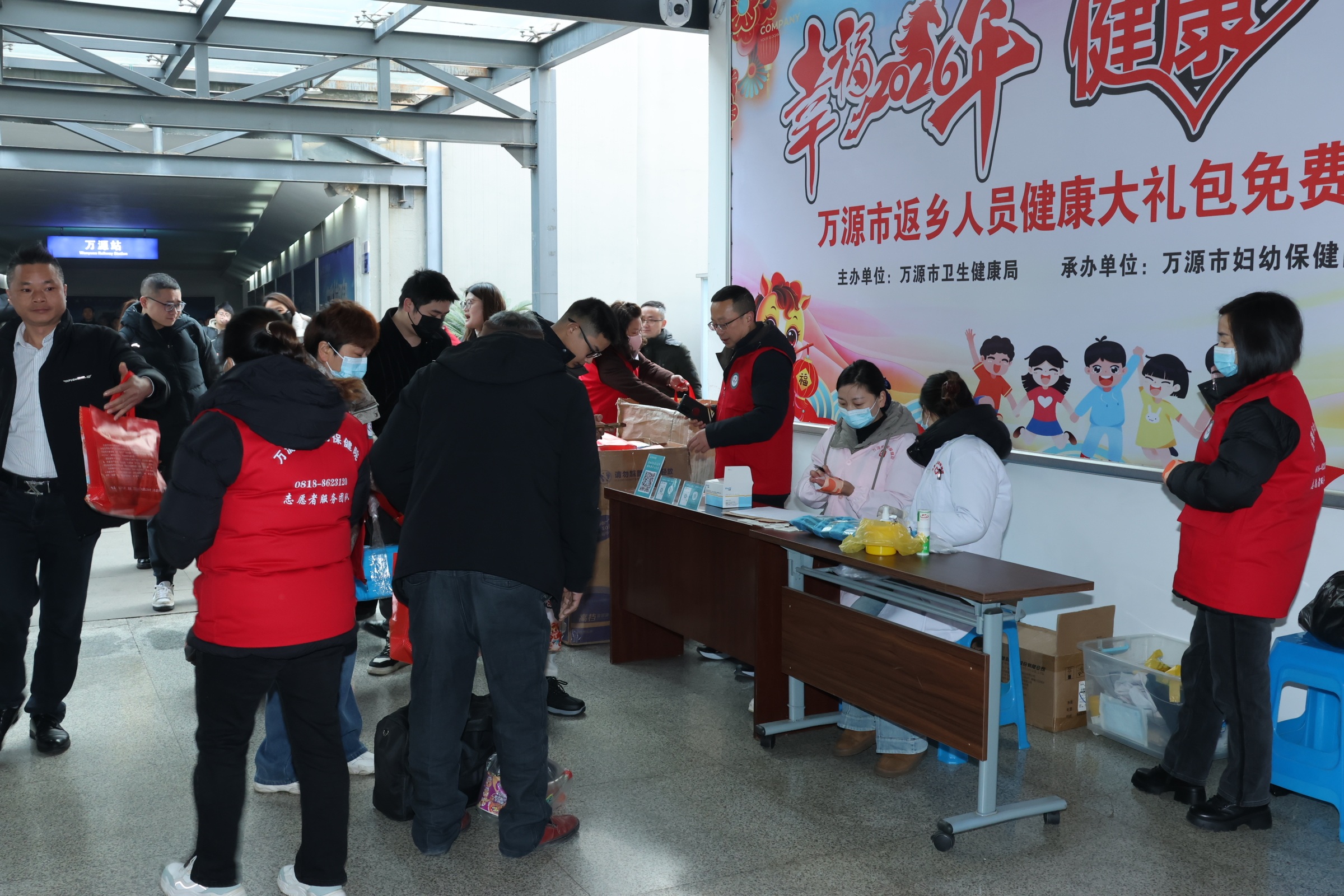 2月2日,在万源市卫生健康局的牵头组织下,万源市妇幼保健院在火车站开展“幸福马年·健康万源”健康大礼包免费发放暨健康惠民服务活动,以贴心举措护航返乡人员健康,让归乡之路充满温度。