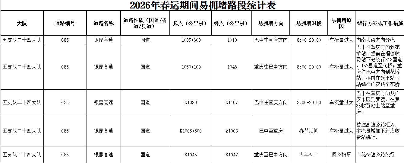 易发生拥堵的路段主要包括:G85银昆高速的营达互通、广门互通、花桥收费站、伏龙收费站等路段,巴中与重庆双向车流尤为密集。
