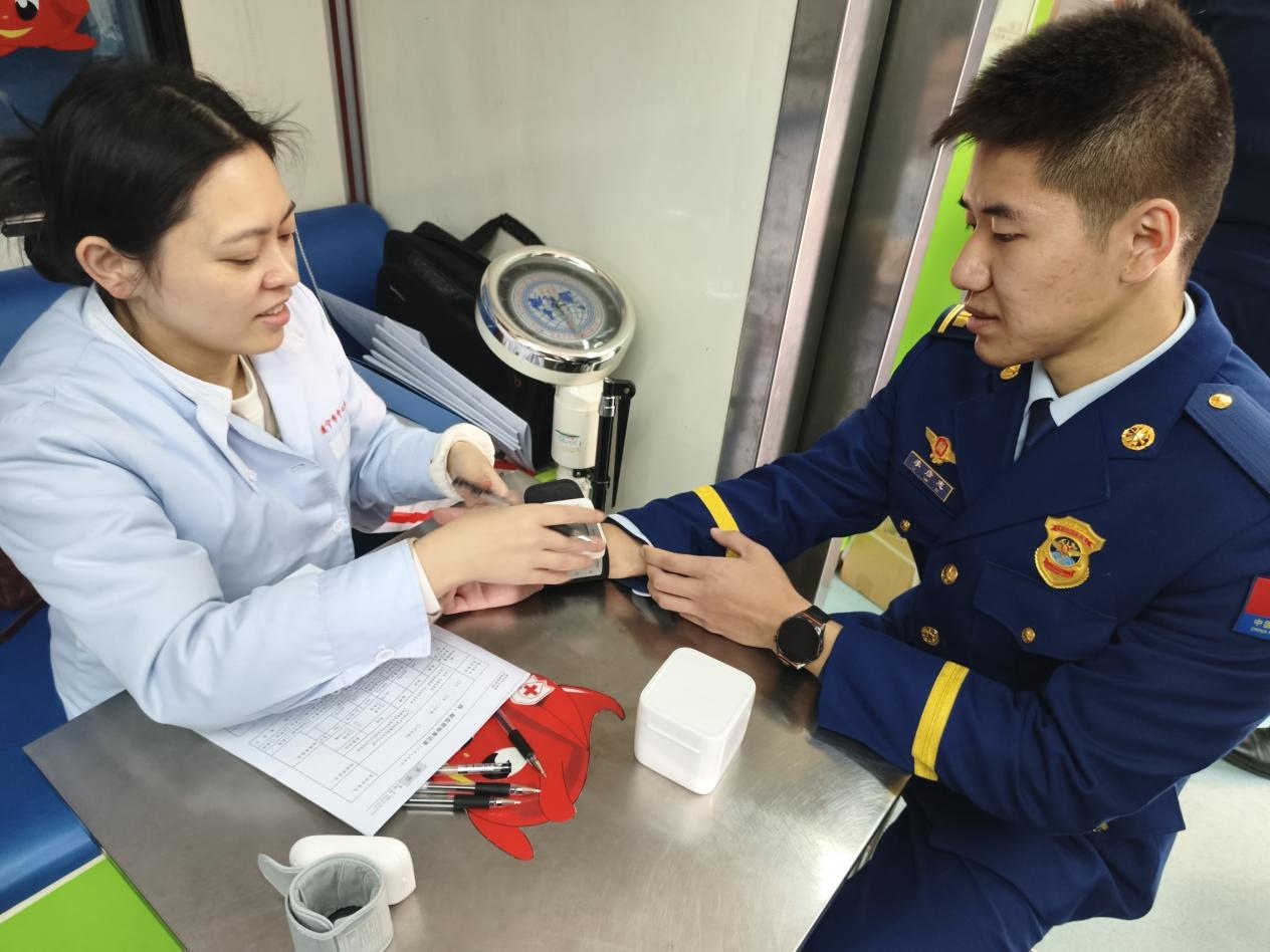 上午9时30分,指战员身着制服整齐列队,在医护人员指引下,有序完成信息登记、血压测量、血液初筛,流程紧凑却不失秩序。在队伍中,既有数次挽袖、轻车熟路的“献血老将”,他们目光沉静,神情自若,献血证上记录着持续的爱心轨迹;也有略带紧张却跃跃欲试的“新兵”,在队友们的鼓励下,第一次勇敢伸出手臂,眼神中闪烁着坚定与自豪的光芒。无论经验深浅,每一位队员的脸上都洋溢着奉献后的满足感与责任感。