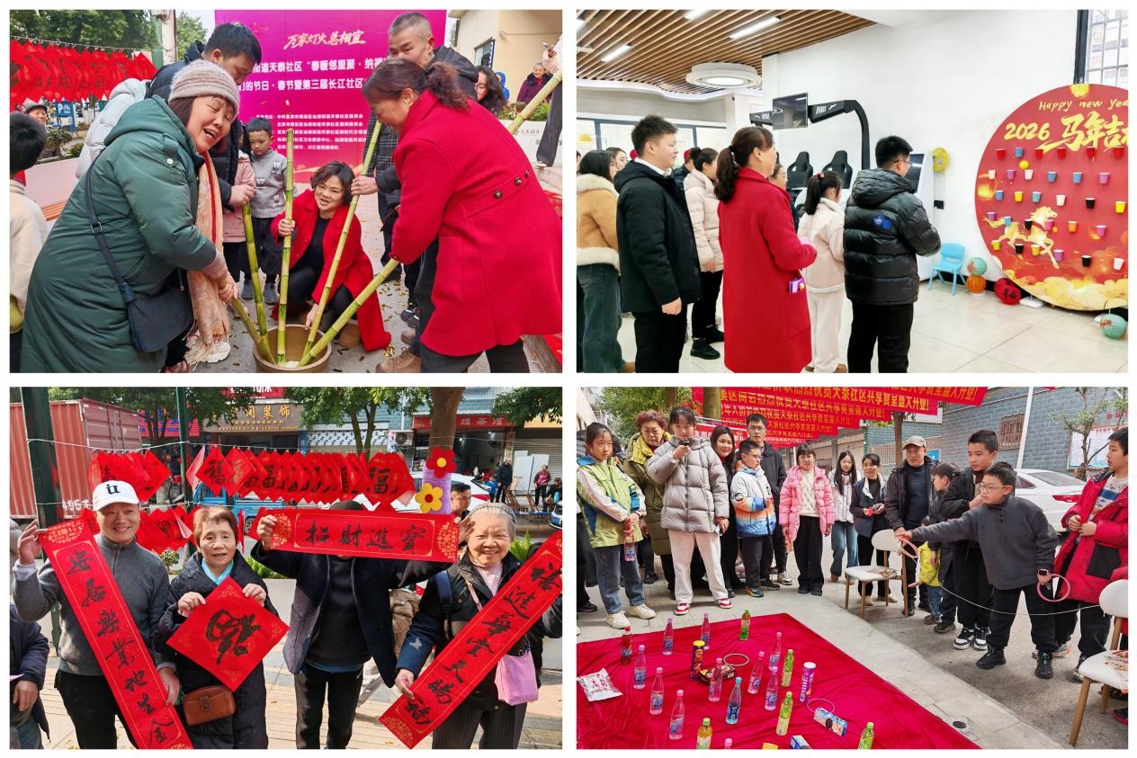 骏马迎春添喜气,邻里欢聚纳吉祥。为传承中华优秀传统文化,丰富社区居民精神文化生活,让大家在辞旧迎新的喜悦中感受邻里温情与社区关怀,2月5日,宜宾市南溪区仙源街道天泰社区举办“春暖邻里聚•纳福享便民”我们的节日——春节暨第三届长江社区文化节活动。活动现场张灯结彩、笑语盈盈,一场集趣味互动、便民服务、年味体验于一体的盛会,共计约300余名居民参与活动,为冬日的社区注入了浓浓暖意与勃勃生机。