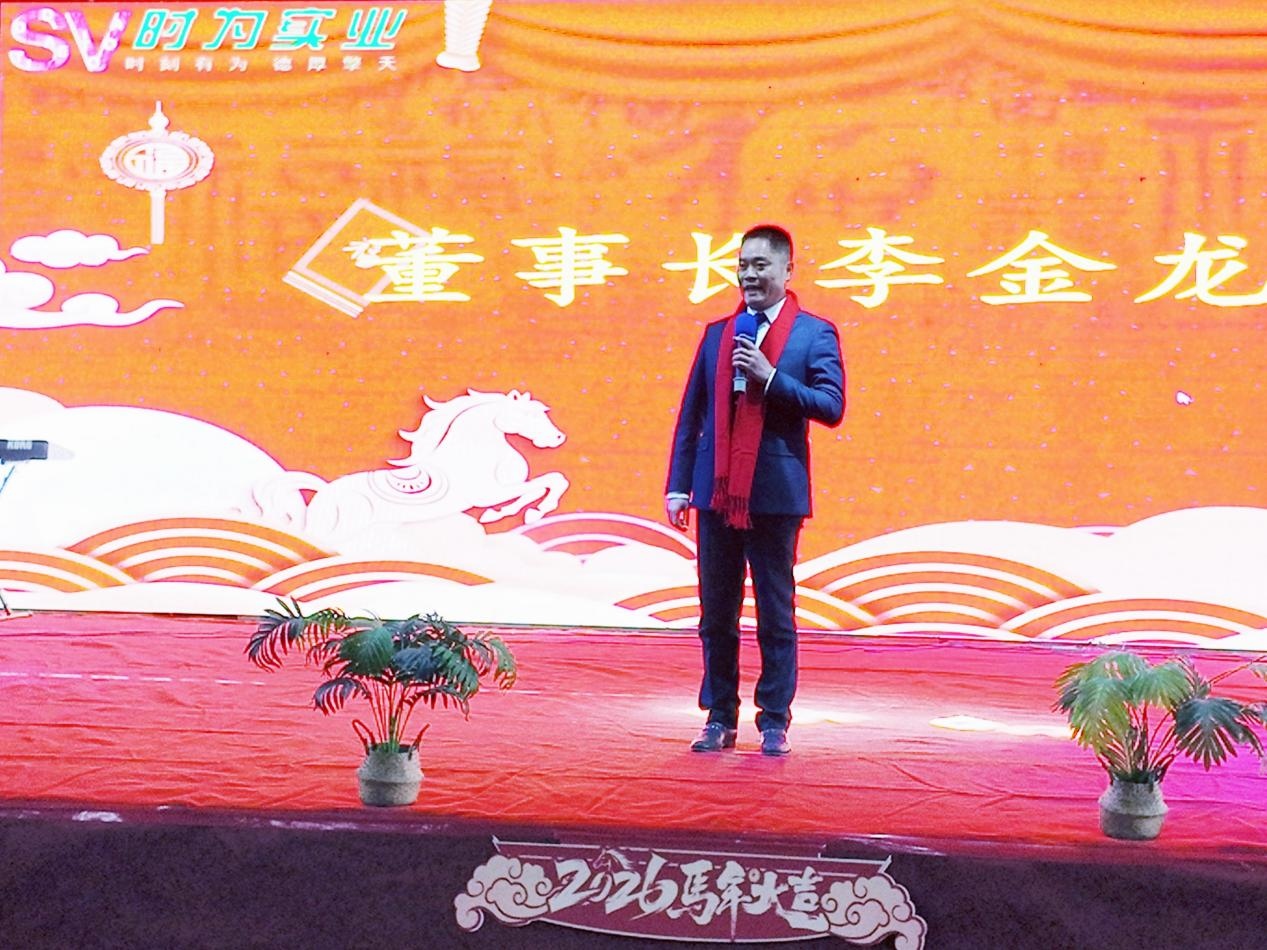 泸州时为实业有限公司董事长李金龙在大会致辞中表示,2025 年公司在全球经济寒流与行业调整双重压力下,经营指标未达预期甚至出现亏损,但“十八同程”的凝聚力与员工坚守是企业宝贵财富。他向获奖先进集体与个人致敬,号召全员践行“时刻有为 德厚擎天”的时为文化。展望 2026 年,他发布“五大核心战役目标”:规模翻身战全年营收 2 亿、冲刺 3 亿;转型拓业战上半年确定新项目;现金保卫战新项目回款率超 90%、老项目回款超 6000 万;安全守护战实现安全生产“零事故”;效能激活战焕新文化、提升效能。他强调 2026 年是开局决战之年,“时为”将凝聚多方之势携手共创明天,最后带领大家举杯共祝。