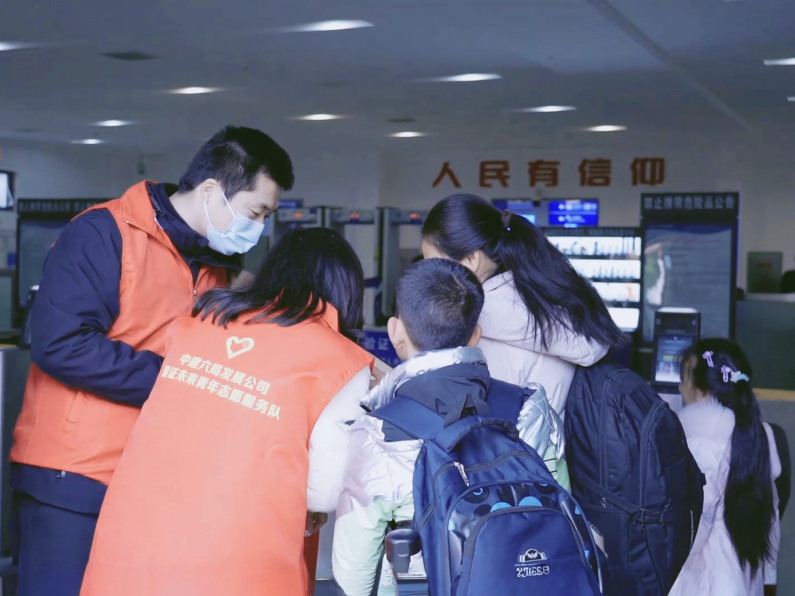 服务过程中,青年志愿者们看到各自背负沉重行李的母子三人,他们立即上前提供帮助。聊天中,这位母亲提到,她们刚从广州返乡,要在这里买票继续乘车返乡,丈夫为了多挣些钱要在工厂加班,便由她一人带孩子先回老家陪伴老人过年,让老人看看几年未见的孙子孙女。送至进站口,这位母亲连声道谢,她告诉志愿者:“返乡这一路,都有志愿者送上服务,暖心更贴心,让回家过年更开心”。