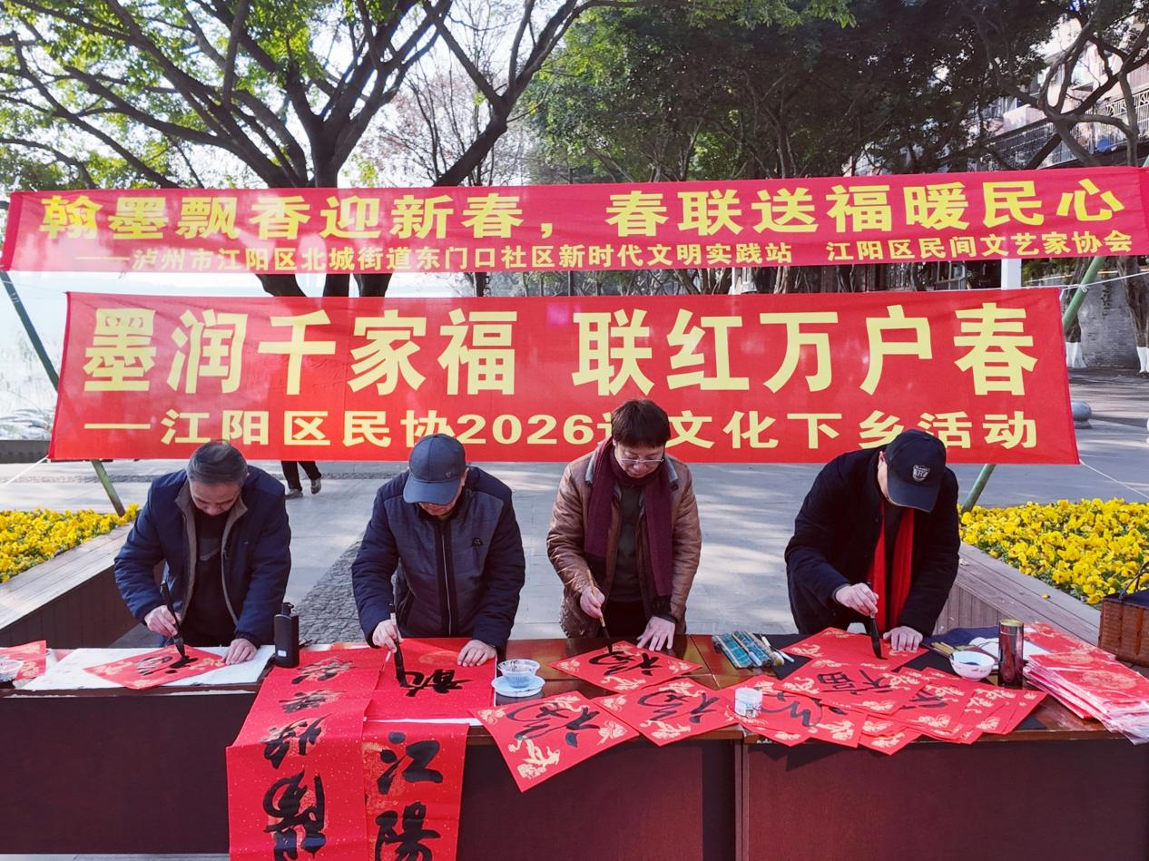 2月11日上午,泸州市江阳区北城街道东门口社区的东门广场人头攒动、墨香四溢,江阳区民间文艺家协会“墨润千家福·联红万户春”2026送文化下乡活动在此火热开展。协会精心组织书法专委会的5名中、省、市书法会员来到现场,与社区居民积极互动,挥毫书写春联。一个个“福”“安”“顺”“贵”“富”等寓意吉祥的字,在笔下诞生,将传统文化与惠民服务实实在在地送到了群众家门口。
