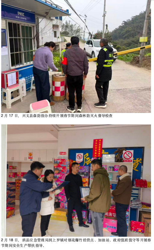 “节日期间安全生产不能松懈,应急值守必须到位,隐患要第一时间整改消除。”2月17日,筠连县应急管理局节日巡察组深入一线,先后前往镇舟镇加油站、团林苗族乡、高坪苗族乡交通劝导点、沐爱镇烟花爆竹零售点、蒿坝镇付家沟采石场等重点场所开展安全检查。