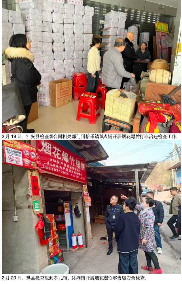 检查组深入乡场镇各超市、小卖部、烟花爆竹零售点等重点场所,重点检查经营户是否具备合法经营资质、烟花爆竹储存是否符合安全标准、消防器材是否完好有效,同时排查是否存在违规销售、储存“三无”烟花爆竹等违法违规行为。