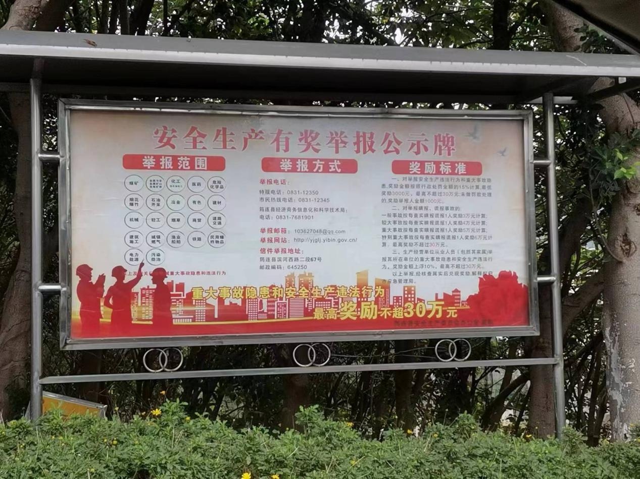 宜宾某厂区张贴安全生产有奖举报公示牌,畅通监督渠道。