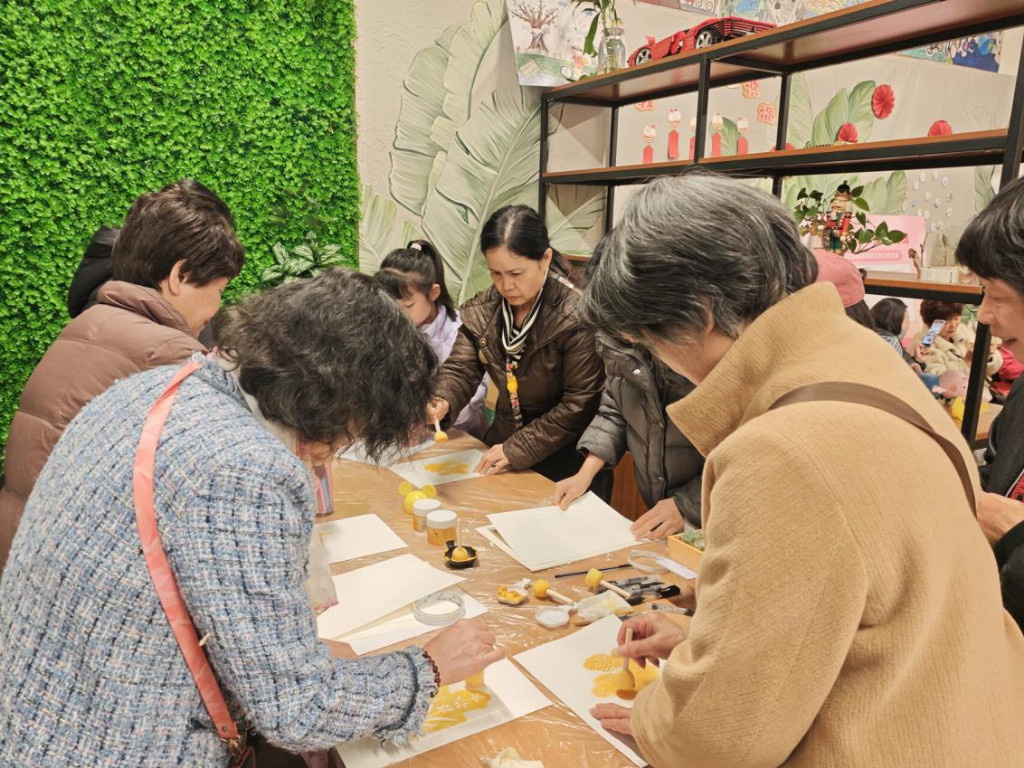 钩织环节结束后,活动进入廉洁拓印体验区。志愿者提前准备了刻有“梅”“兰”“竹”“菊”及莲花图案的拓印模板。居民们亲手铺纸、蘸墨、均匀按压,随着模板轻轻揭起,清晰的廉洁印记跃然纸上。