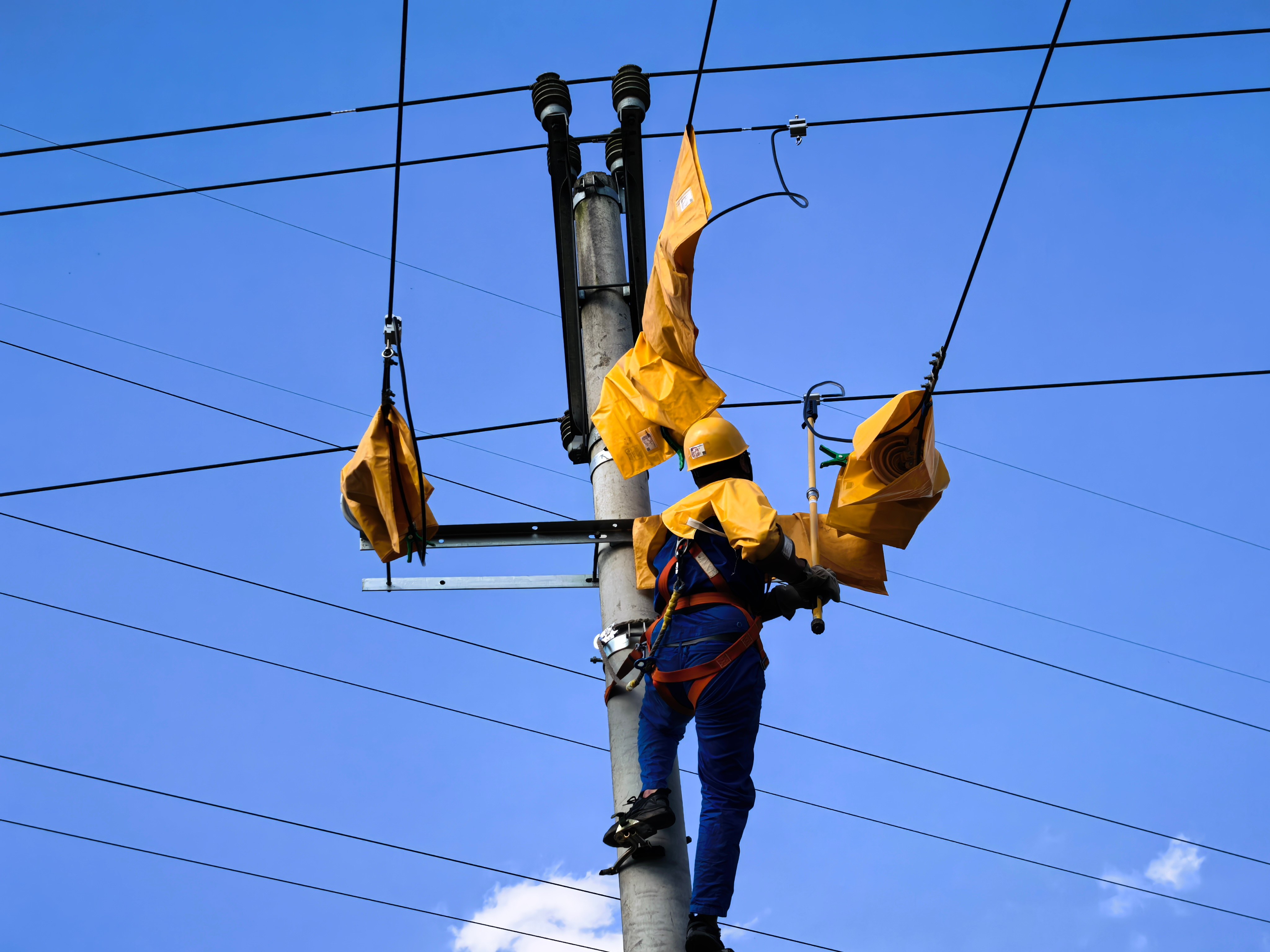 在10千伏大吉线彭井村1社支线1号杆作业现场,带电作业人员全副武装,佩戴专业防护装备,迅速投入战斗。他们严格按照规范流程,有序完成现场安全措施布置、验电等准备工作,智能自动绝缘剥皮器在地面人员的精准操作下,杆稍导线绝缘层逐一被剥掉。随后,大家细致核对引线长度、安装设备线夹,对带电线路进行全面绝缘遮蔽,熟练地开展起引流线搭接作业。高空之上,作业人员严谨细致,规范操作;地面之间,监护人员全程紧盯作业每一个步骤,确保每一次操作精准无误。带电作业在花田间勾勒出电力人坚守一线的动人画面。