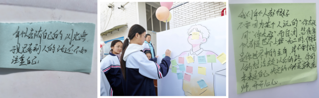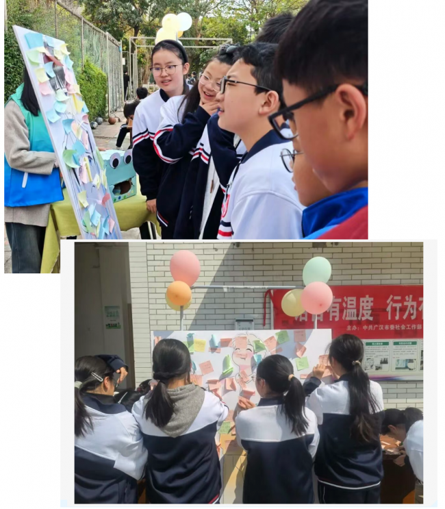 同学们亲手撕下伤人标签投入回收箱,在便利贴上写下暖心话语贴满笑脸 KT 板,用行动践行 “拒绝伤害,传递温暖”。
