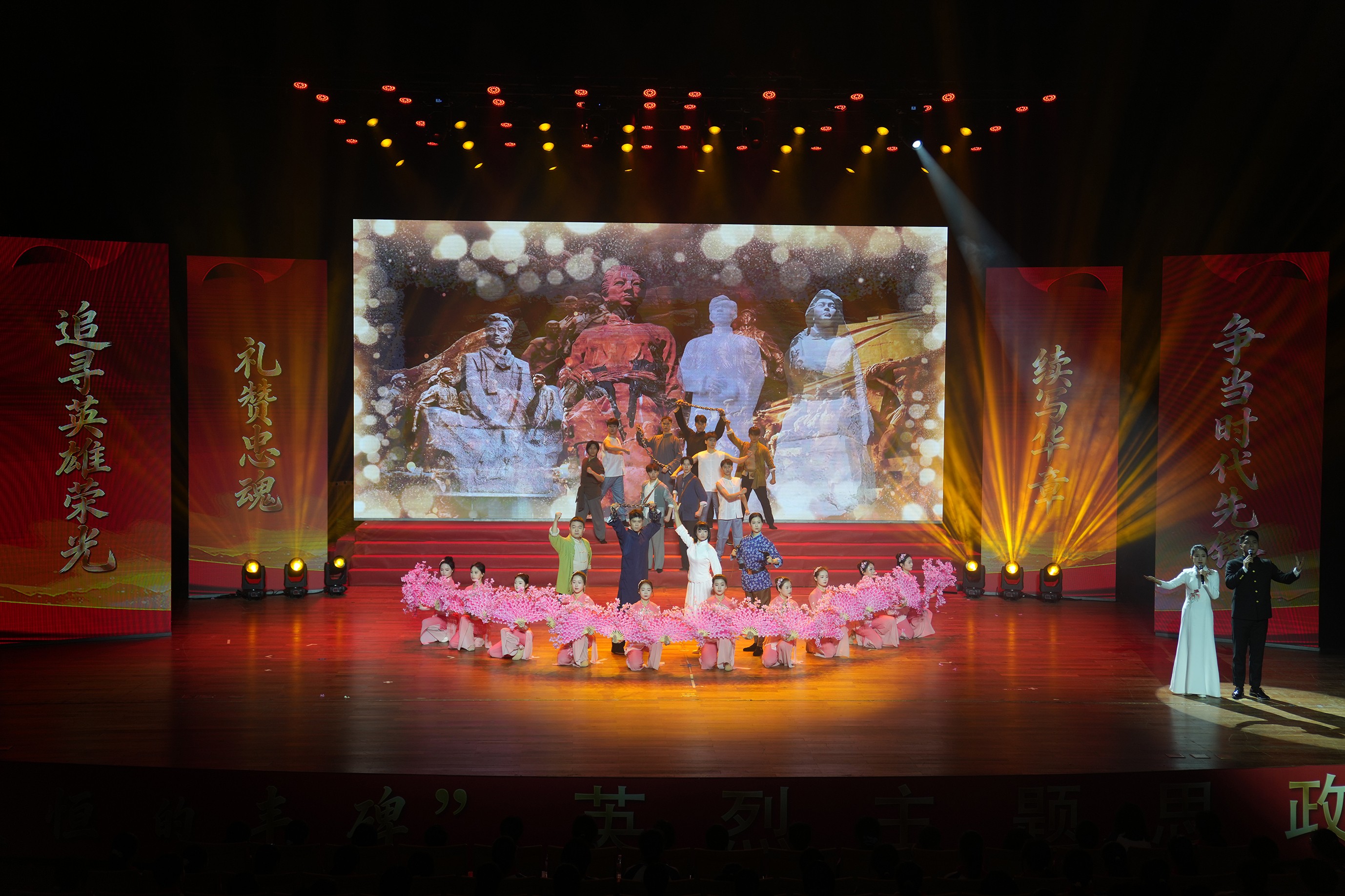 “那些为民族独立、人民解放、国家建设挺身而出、浴血奋战的英雄烈士,恰是巍巍丰碑,矗立天地之间,照亮我们前行的道路。”在群舞《胜利凯歌》中,主题思政课拉开序幕,掀开了川渝儿女用热血浇灌信仰的宏大叙事序幕,为整堂主题思政课活动奏响震撼人心的强音。