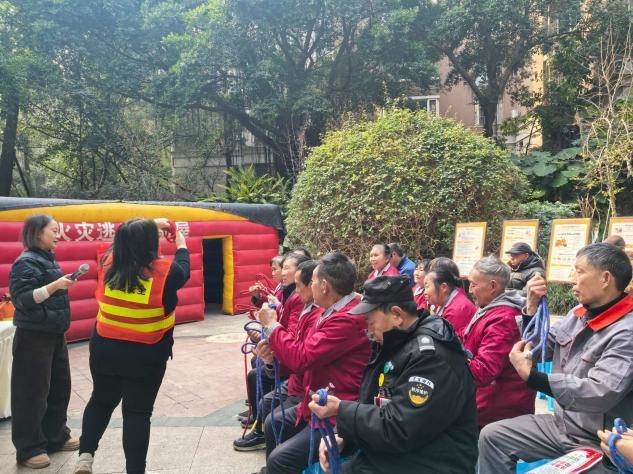 理论讲解结束后,实操演练环节紧锣密鼓展开。消防老师现场演示了灭火器、安全绳的结法以及防毒面具的正确使用方法,在灭火器讲解环节详细拆解“提、拔、握、压”四大关键步骤,并强调了灭火时的安全距离与站位技巧。随后,大家分组上前实操,在老师的一对一指导下,亲手操作灭火器扑灭模拟火源,将理论知识转化为实际操作能力。不少居民表示,此前虽见过灭火器,但从未实际使用,通过此次实操,真正掌握了核心技能,心里更有底了。