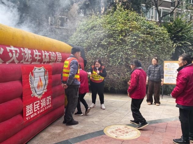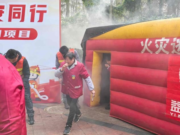 此次活动的亮点环节——逃生篷体验,让参与者身临其境感受火灾现场的逃生场景。逃生篷内模拟了火灾发生时的浓烟环境,光线昏暗、能见度低,还原了真实火灾中的逃生困境。在消防老师的指引下,参与者们弯腰低姿、用湿毛巾捂住口鼻,沿着安全通道快速有序撤离,切实体验了火灾逃生的正确流程与技巧。通过沉浸式体验,大家深刻认识到逃生时保持冷静、遵循规范的重要性,有效提升了应急逃生的实战能力。