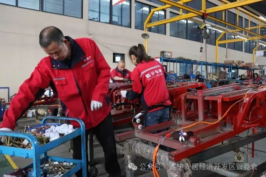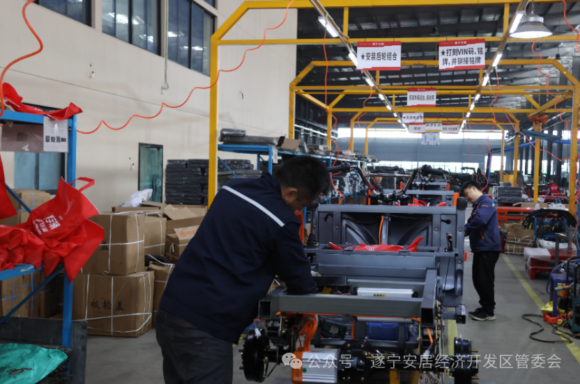 在凯希蜀宇生产车间内,高智能化生产线正高速运转,工人们在进行焊接、组装等作业,为一批发往欧亚的电动三轮车做最后冲刺。