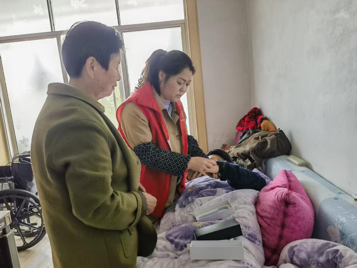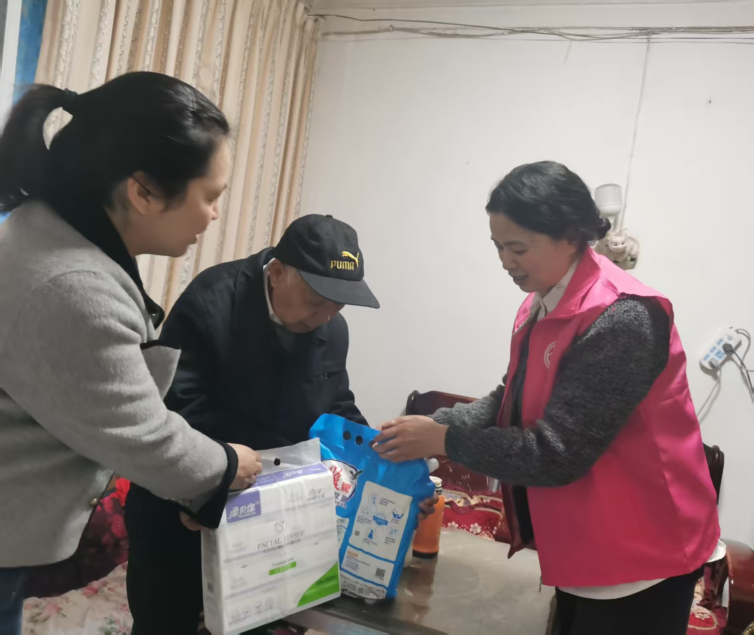 上午9点30分,各配送小组在社区集合点整装待发,东河镇驻印月潭社区干部、社区组长与志愿者共同清点物资、核对清单后,带着满满爱心分赴老人家中。每到一户,驻社区干部与志愿者都轻声敲门、亮明身份,细心核对老人信息后,将慰问物资亲手送到老人手中,与老人促膝交谈,耐心询问身体状况、居家生活难题;志愿者们贴心询问老人智慧手环的使用情况,了解手环操作是否顺畅、功能是否正常,及时记录老人使用中的问题与需求,用亲切的话语、暖心的举动缓解独居老人的孤独感。征得老人同意后,大家与老人温馨合影,定格这份基层关怀与社企温情的暖心瞬间。
