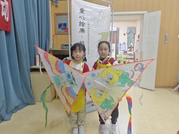 经过孩子们的细心绘制,一只只承载着美好寓意的风筝完成了。孩子们和亲手将自己绘制的“廉洁风筝”拍照留念。