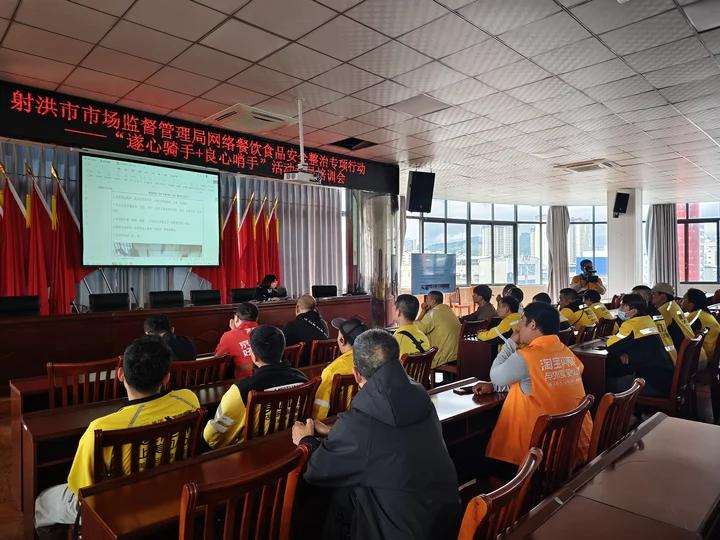 4月15日,射洪市市场监管局组织召开网络餐饮食品安全整治专项行动—“遂心骑手+良心哨手”活动动员培训会,专班全体成员及外卖配送骑手代表参会。