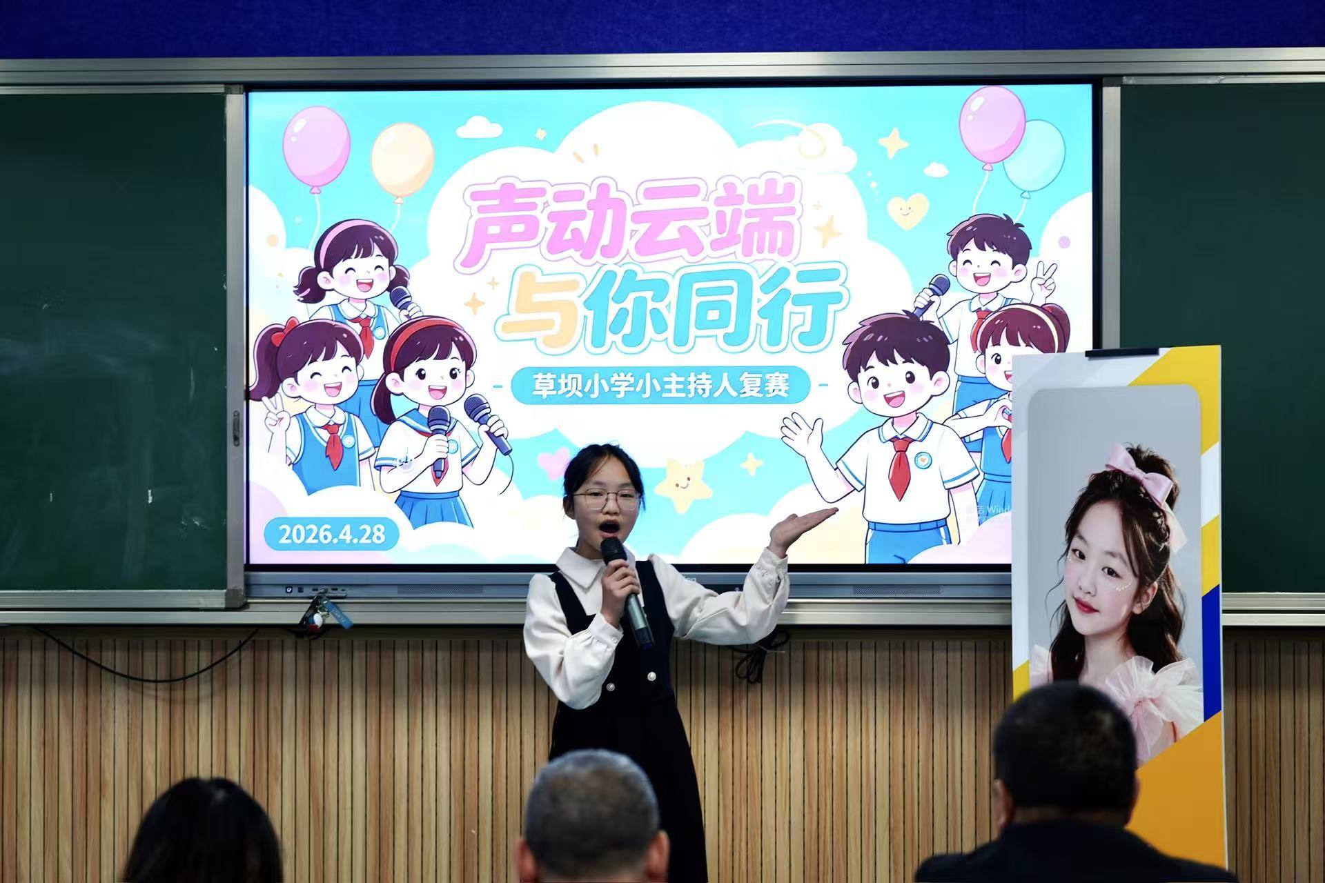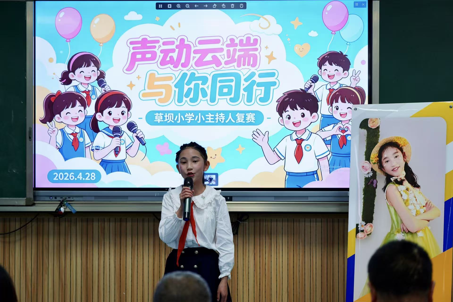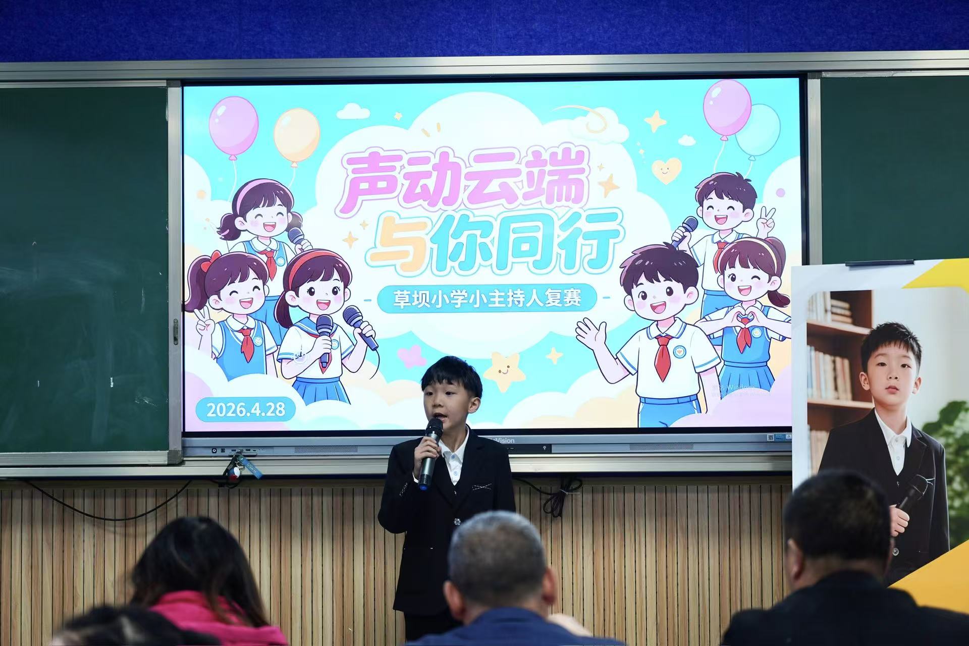 4月28日,草坝小学校园里回荡着清脆悦耳的童声,一场别开生面的“声动云端,与你同行”小主持人复赛正在热烈进行。经过前期层层选拔,脱颖而出的优秀选手们齐聚赛场,用话筒传递梦想,用自信点亮舞台。