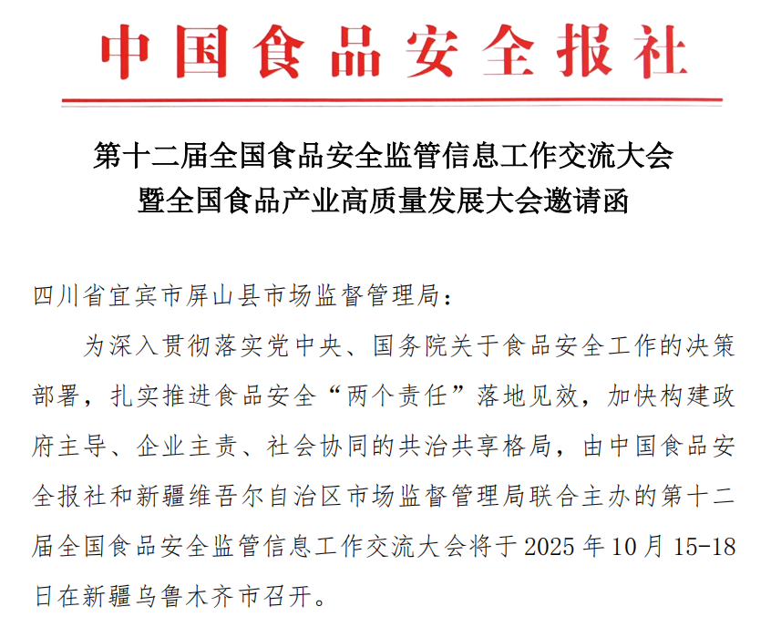近日,屏山县市场监管局收到中国食品安全报社(市场监管总局、国务院食安办主管)书面邀请函,邀请参加由该报社和新疆市场监管局联合主办的第十二届全国食品安全监管信息工作交流大会暨全国食品产业高质量发展大会,是全省市场监管系统收到邀请函的为数不多的单位之一。大会将于2025年10月15~18日在新疆乌鲁木齐召开。