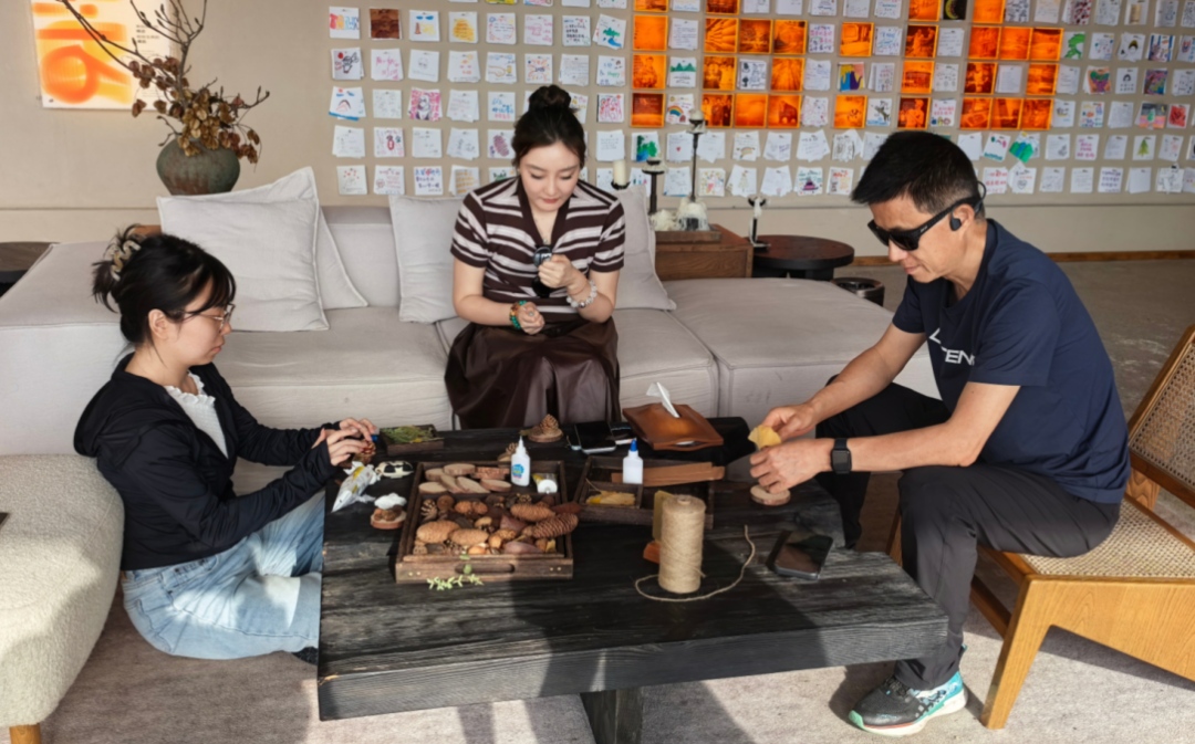 10月7日,游客杜希和同伴在“上山上·抱翠”民宿的咖啡厅兴致勃勃地用胶水和松果做起了冰箱贴,随后拍照留念,打算回去发个美美的朋友圈。她表示,这是第一次来到“上山上·抱翠”,确实身处翠绿色之中,良好的生态、清新的空气都给她留下了深刻印象。