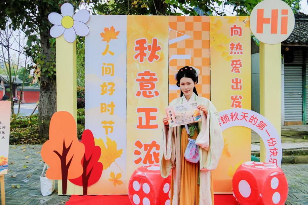 “绘秋·植物工坊”环节中,游客们在三线时光的植物创意工坊里,用采集的素材拼贴装饰画、拓印帆布包,将古城秋意亲手带回家;红枫园、文/武庙门口等打卡点前,大家纷纷定格秋日美景,在此“赏秋·打卡留念”带话题分享再获额外银票,定格美好瞬间。
