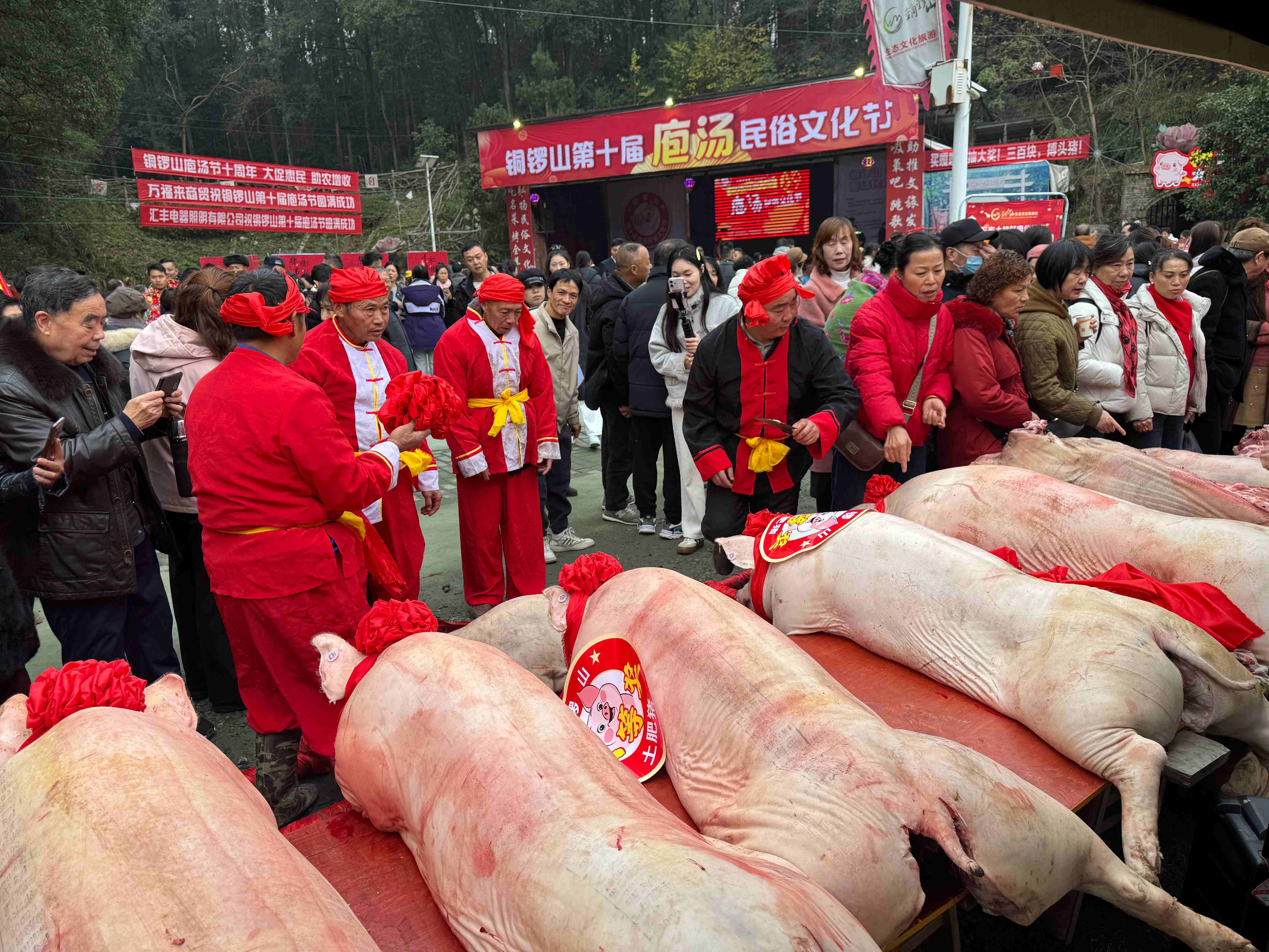 “我是跟着旅行团一起来的,这趟太值了。”12月16日,邻水县铜锣山生态旅游度假区,第十届庖汤民俗文化节如期而至,来自重庆市两江新区的退休职工赵良华拿着刚买的6斤土猪肉,笑得合不拢嘴。