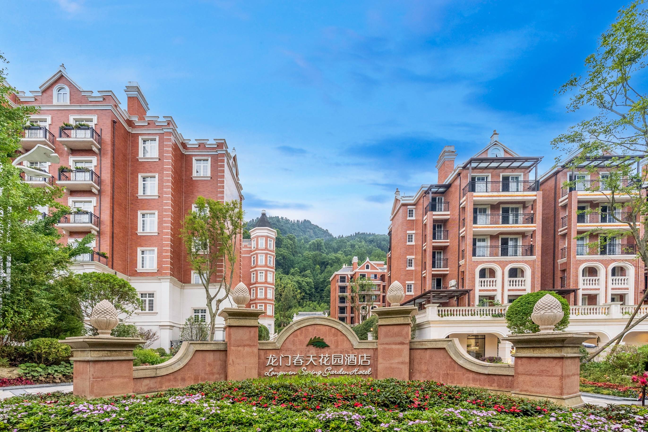 龙门春天花园酒店位于彭州市龙门山镇宝山村,地处成都“北部花园”核心区域,距成都市区仅1.5小时车程。酒店周边自然资源丰富,拥有立体山水、森林飞瀑、富氧气候等独特生态环境,并配备珍稀氨氟医疗热矿泉,水温常年保持在45℃以上,对关节炎、皮肤病等具有显著理疗效果,具备天然的疗养优势。