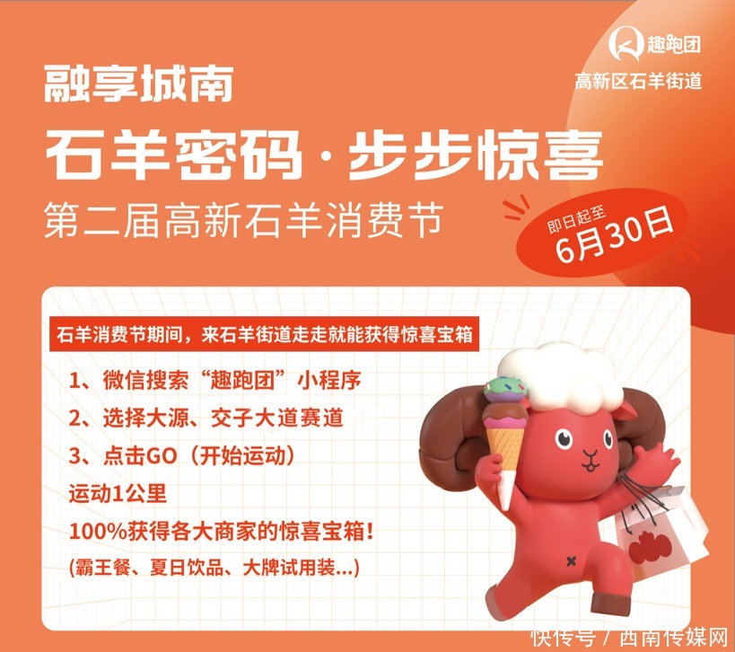 通过策划推出“趣跑团”线上直播运动消费共享活动,打造运动、消费、娱乐全新场景,用趣味游戏式的玩法,激励健步、跑步的居民、跑友来石羊运动,达到相应里程、特定点位打卡可获得各类优选奖品,趣味打卡、惊喜多多、聚合流量、交互增长。