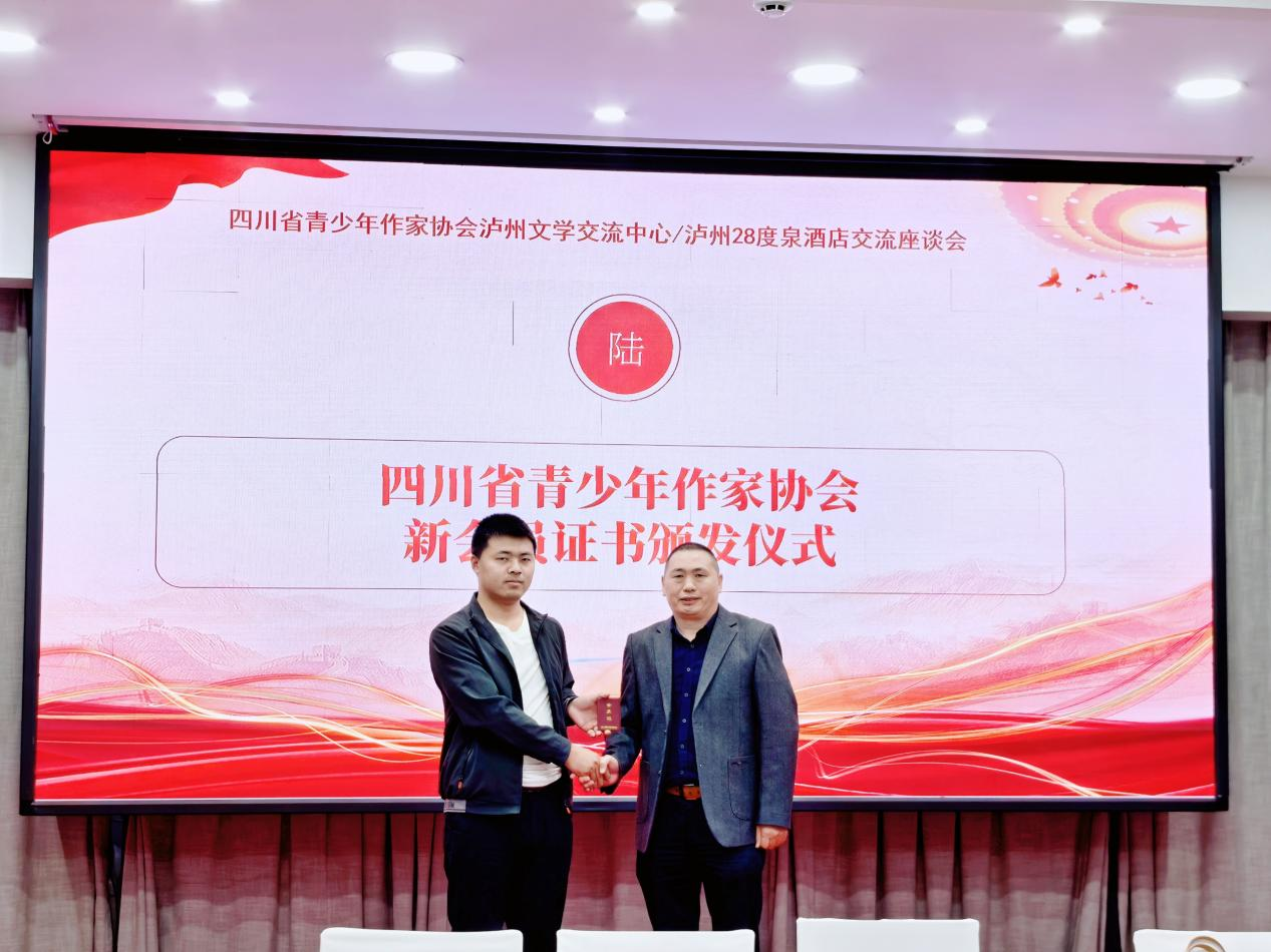 会上,还举行了四川省青少年作家协会新会员证书颁发仪式,游明刚主任代表四川省青少年作家协会向新会员肖诗新颁发会员证书。