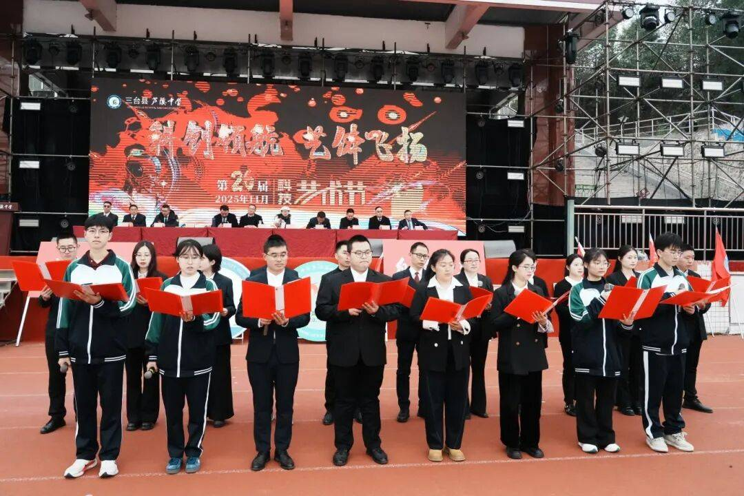 秋阳清朗映照运动场,科创逐梦开启艺术节!11月26日上午,三台县芦溪中学运动场上人潮涌动、彩旗飘扬,全校师生齐聚一堂,第二十六届“科创领航 艺体飞扬”校园科技艺术节盛大开幕。这场融体育竞技、艺术展演与科创体验于一体的盛会,是对教育部等七部门《关于加强中小学科技教育的意见》的生动实践。三台县科学技术协会副主席王锦秀亲临现场,与师生共赴青春之约。